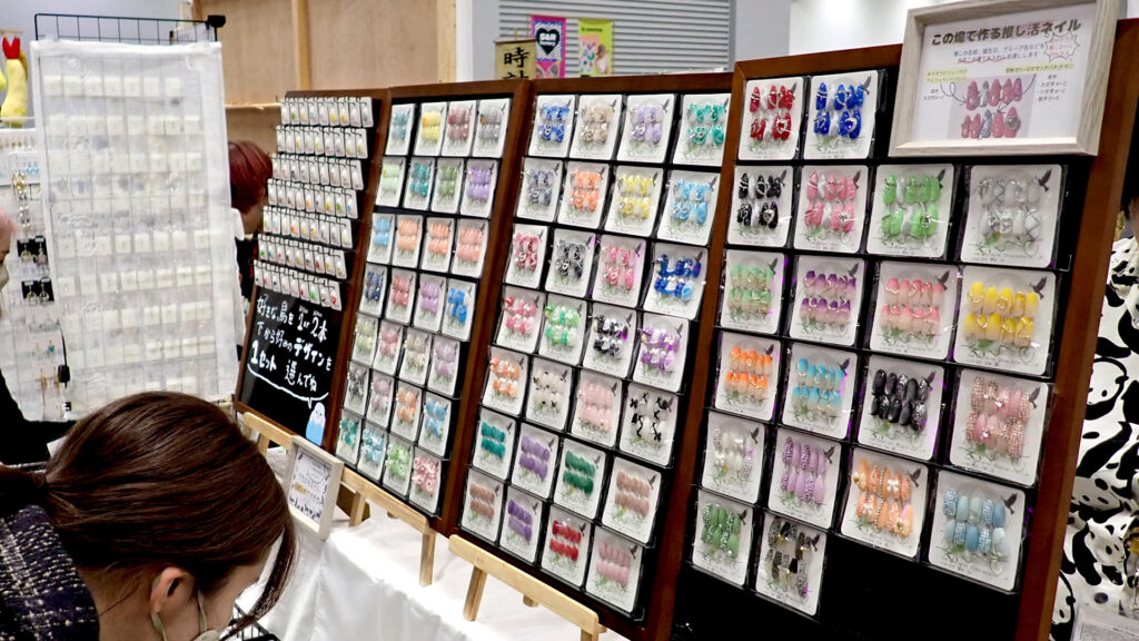 アクセサリーエリアに出展していた「J-SON」さんは、オーダーメイドで世界に一つだけのネイルチップを作る作家さん。「“大好き”を爪にのせて爪先まで大好きになれるように願いを込めて」という思いと共に、Instagram上で全国から“推しデザイン”のネイルのオーダーを受け付けています。J-SONさんに自分の推しキャラを伝えると、キャラのイメージに合わせたニュアンスのネイルや雑貨を作ってくれるといいます。